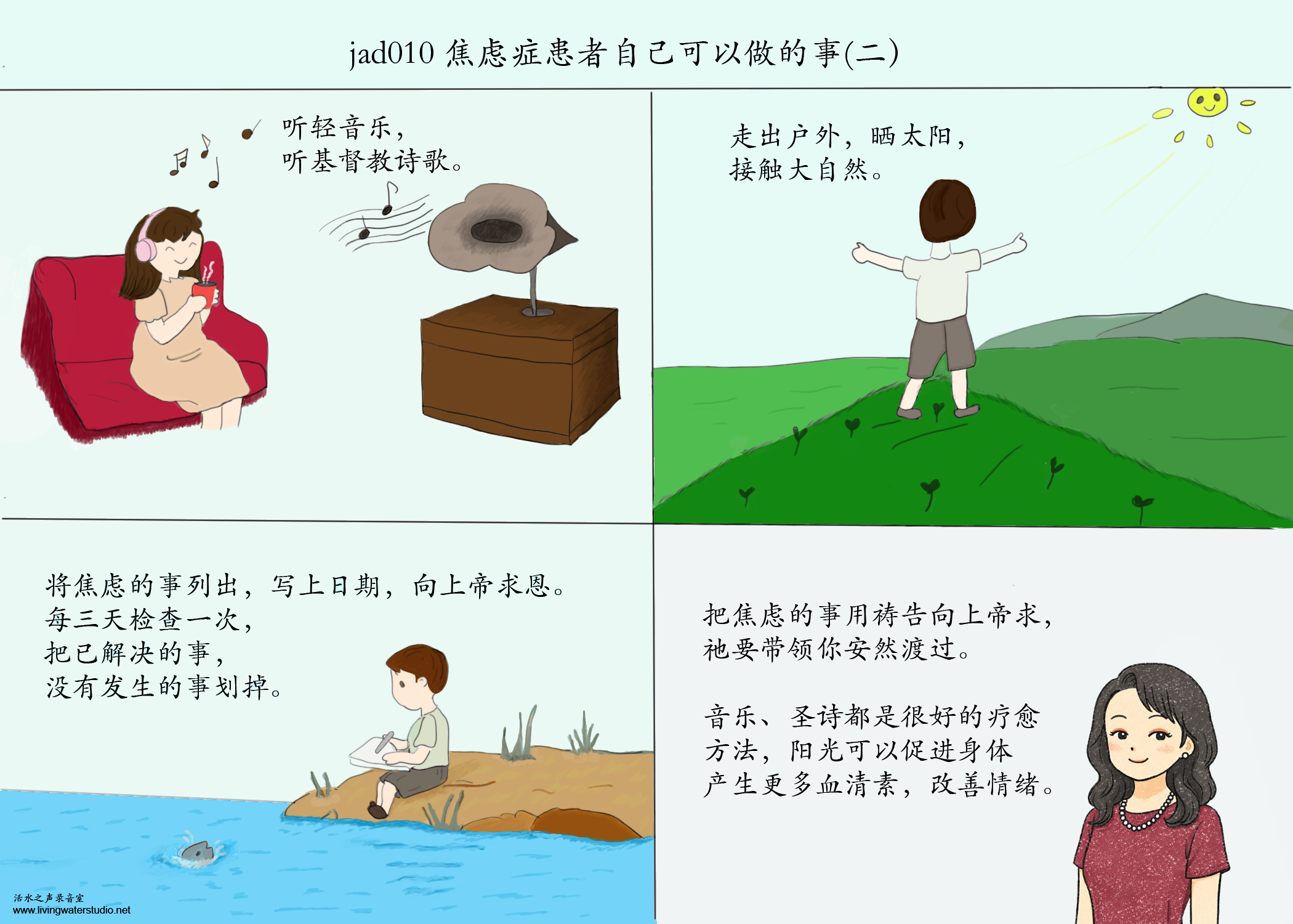www.livingwaterstudio.netjad008 为什么我吃了这么久的药都还未康复?内容:林丽雯博士图片处理:凯蒂 转载请注明:活水之声 » jad010 焦虑症患者自己可以做的事(二) 喜欢 (0)or分享 (0)