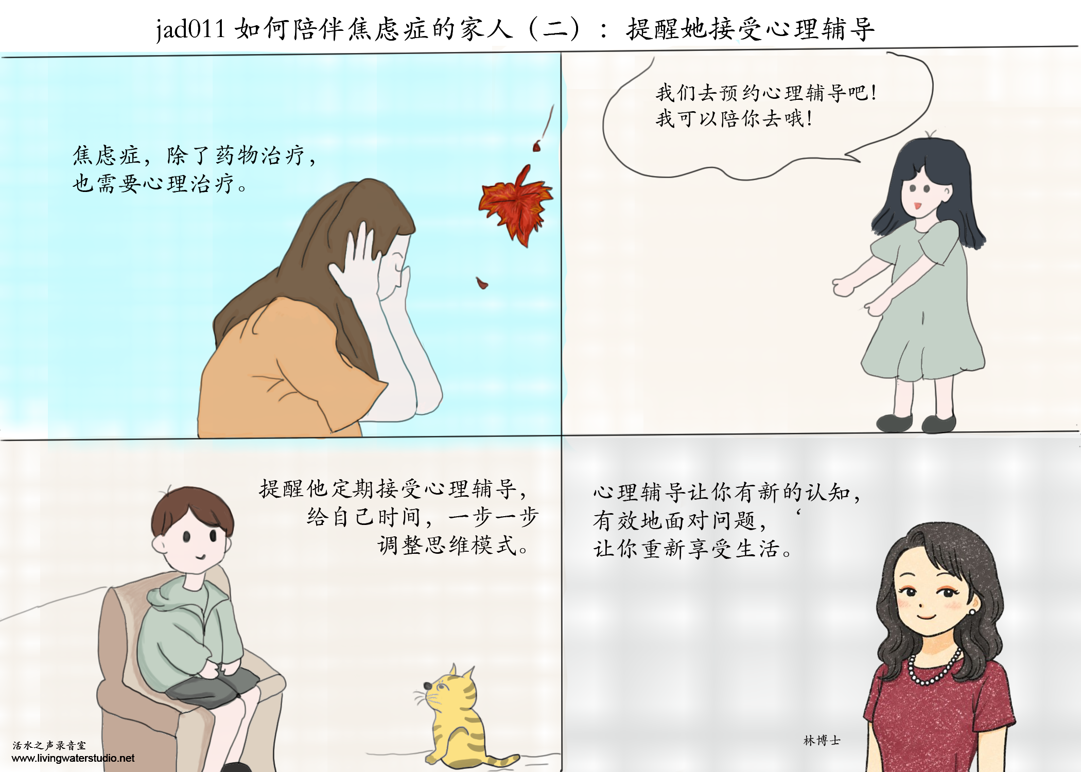www.livingwaterstudio.netjad011 如何陪伴焦虑症的家人(二):提醒她接受心理辅导内容:林丽雯博士图片处理:凯蒂 转载请注明:活水之声 » jad011 如何陪伴焦虑症的家人(二):提醒她接受心理辅导 喜欢 (0)or分享 (0)