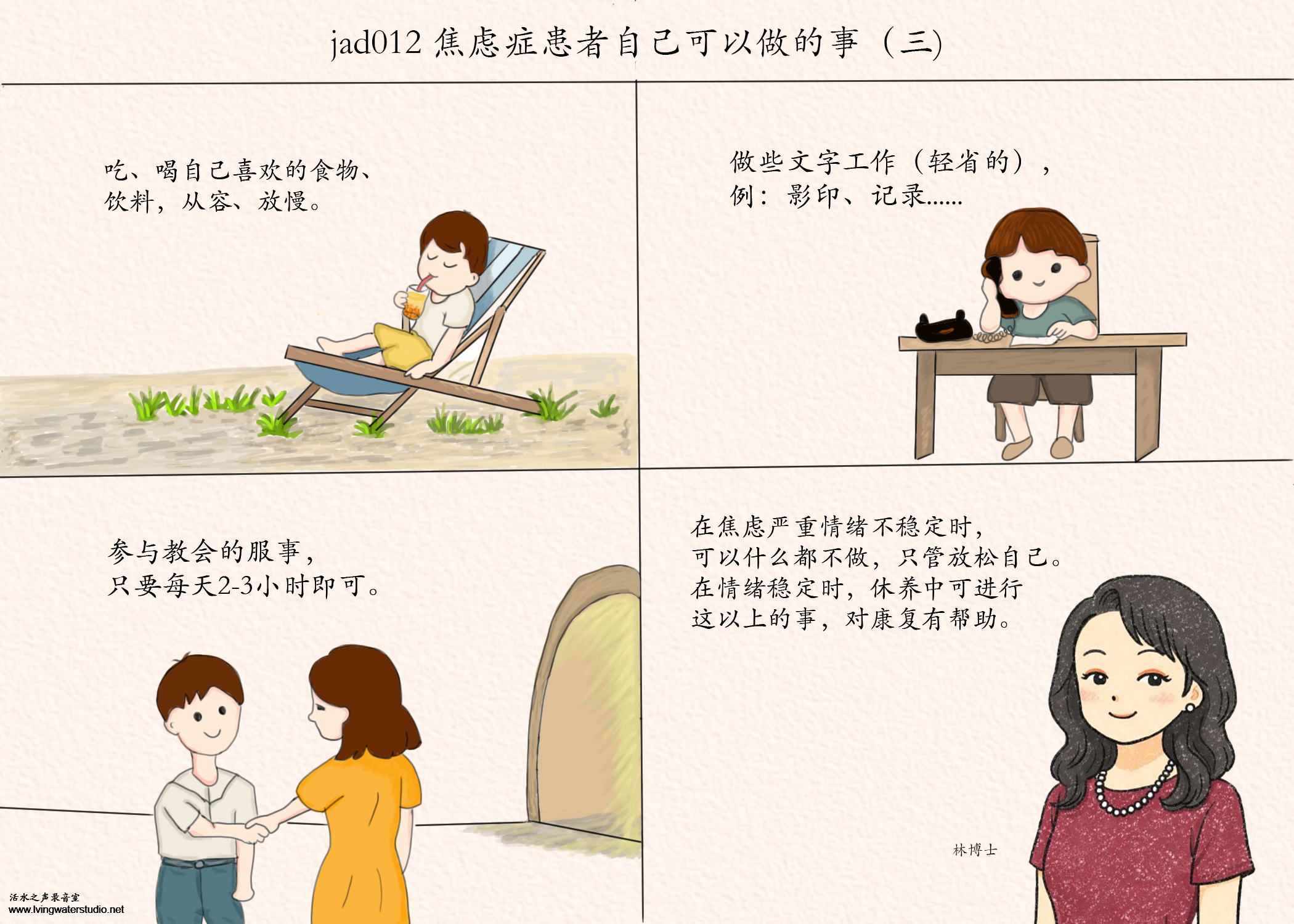 www.livingwaterstudio.netjad012 焦虑症患者自己可以做的事(三)内容:林丽雯博士图片处理:凯蒂 转载请注明:活水之声 » jad012 焦虑症患者自己可以做的事(三) 喜欢 (0)or分享 (0)